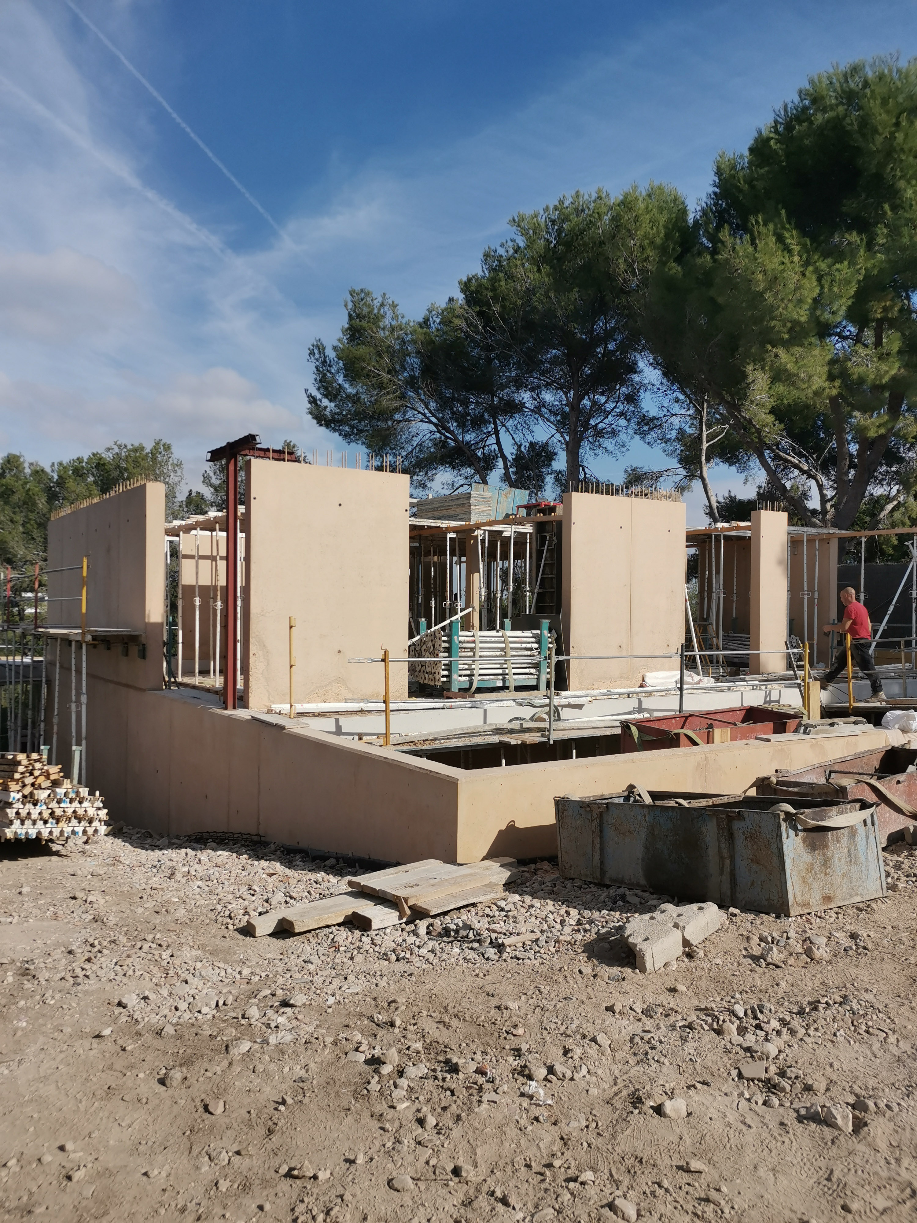 The house features radiant floor heating throughout and an efficient aerothermal system for both cooling and heating. Combined with natural cross-ventilation in all rooms, thoughtful orientation and shading strategies, a rainwater harvesting system, and a palette of local and simple materials, the home achieves a high level of environmental performance. Even the concrete was designed to reduce its carbon footprint: much of the Portland cement was replaced with natural pozzolans; recycled aggregates were used in place of quarried stone; and superplasticizers were added to minimize cement usage. Additionally, the façade incorporates larch wood from sustainably managed forests. Wooden “ribs” on the façade provide shade to reduce overheating and help visually conceal windows on the side elevations that face neighboring homes. The house’s layout also responds to the site’s topography: it is partially embedded into the terrain, balancing excavation and backfill. The basement is offset to align with the site's natural terraces.
